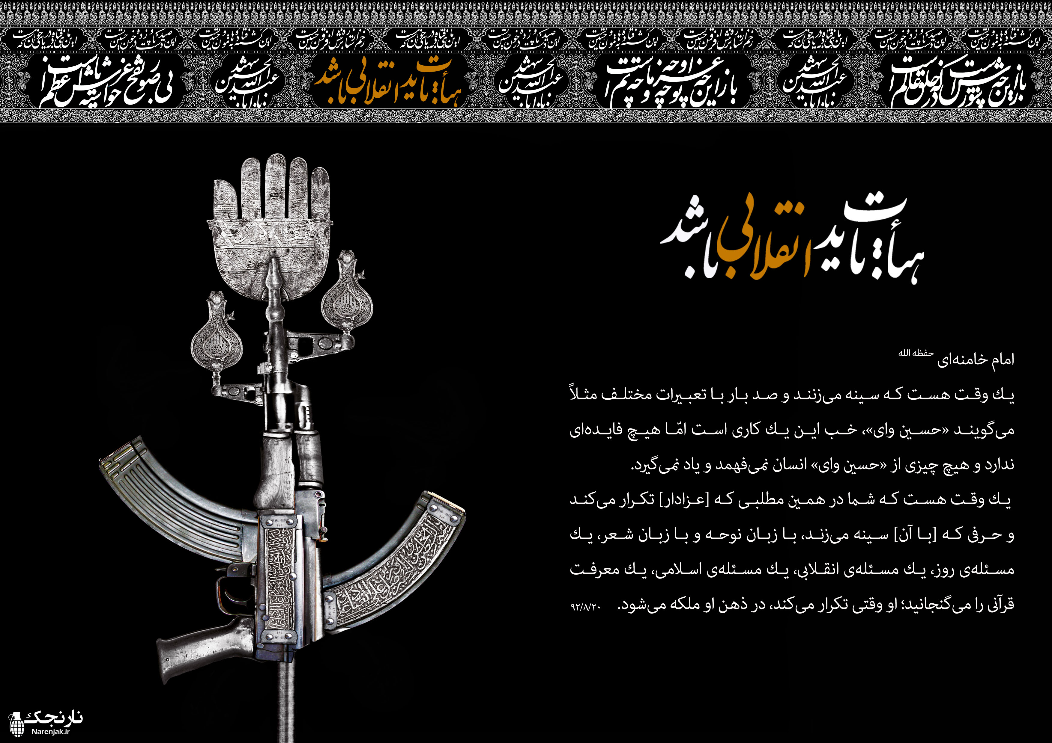 این نماد عاشورایی-انقلابی رو از سایت shiaarts.ir گرفتم. البته از اون جایی که عَلَم خیلی مورد تایید نیست، دوتا اژدها و دوتا کبوتر رو از روی قنداق تفنگ حذف کردم.
